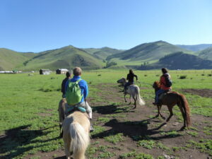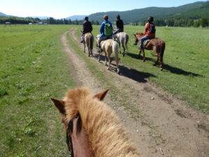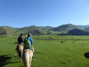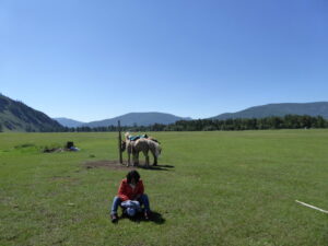 Enfin, enfin!!! Je suis en Mongolie… Le trajet en bus qui nous y emmène depuis la Russie est déjà exceptionnel. Les yeux collés à la vitre, je découvre enfin par moi-même ces immenses plaines verdoyantes dont j’ai tant entendu parler, tous ces chevaux partout, ces yourtes… Je ne suis que dans le bus, et pourtant, c’est déjà bien plus beau, plus magique encore que dans mes rêves les plus fous. Je viens de tomber amoureuse de ce pays.