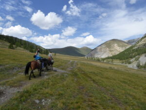 I thus wake up the next day, hyper excited to be able to vanish into Mongolian nature on horseback. The food is on us, we thus go fill up on groceries in the village before we leave. In front of the guesthouse, we meet our guide in his beautiful traditional tunic called a ‘deel’: Oumbar. Nice surprise, he speaks good English! It’s great, we are going to be able to communicate. We load our bags on the back on the fifth horse who is coming with only for that purpose. After saying goodbye to Atle as well as to the other great people who are staying there, that’s it, we are on our way!